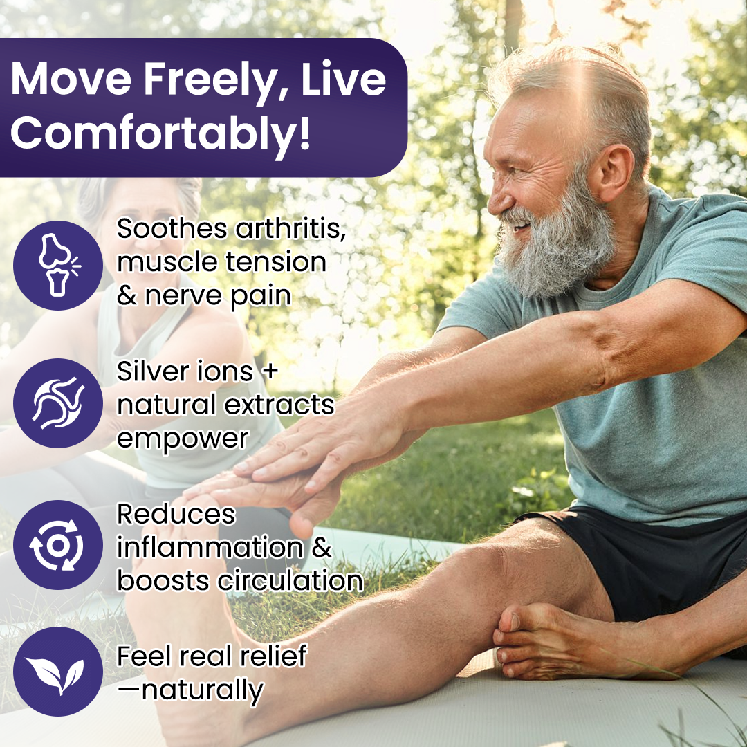 Powered by bioactive silver ions and targeted botanicals, it works to calm inflammatory signals, stimulate micro-circulation, and create an ideal environment for joint recovery.